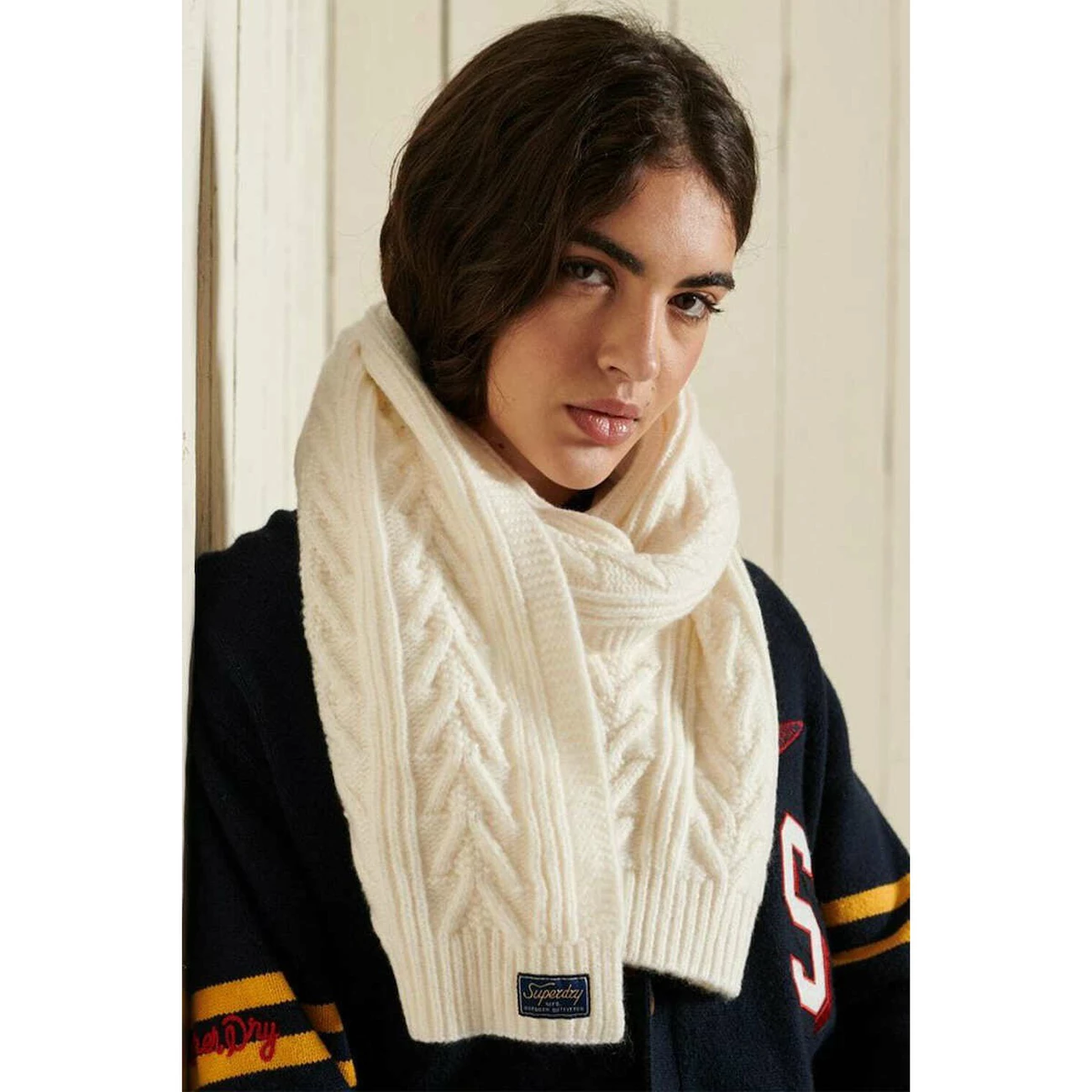 Reste bien au chaud cet hiver avec cette écharpe en maille torsadée ornée de notre écusson signature.